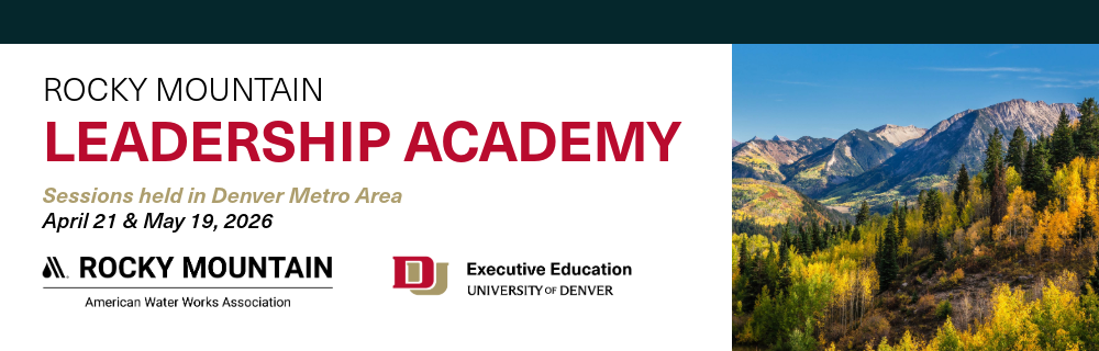 Rocky Mountain Section of the American Water Works Association (RMSAWWA) is proud to partner with the University of Denver to deliver the Rocky Mountain Leadership Academy. This two-day program develops the knowledge, tools and skills today’s leaders need to successfully manage and lead a team. The curriculum combines academic knowledge and industry practices to deliver a comprehensive program which benefits professionals from a variety of backgrounds. Whether you have a few years of experience in leadership or are stepping into a management role for the first time, the Rocky Mountain Leadership Academy will help you reach your leadership potential. The training has been pre-approved for operator credits in Colorado (1.5 TUs), Wyoming and New Mexico. Attendees of this class will receive 15 hours of training credits.